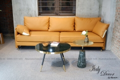 Với màu xanh huyền bí kết hợp inox mạ vàng cao cấp tạo nên sự sang trọng đặc biệt cho không gian phòng khách.